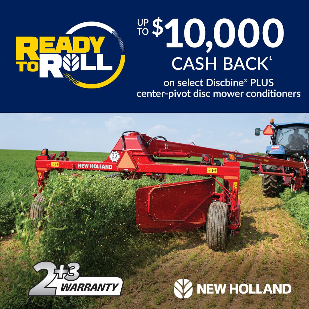 ** For commercial use only. See your participating New Holland dealer for details and eligibility requirements. Cash back applied at time of sale. Cash back offers are only available when financing purchase with CNH Industrial Capital America LLC or CNH Industrial Capital Canada Ltd. Offer is nontransferable. Offers end June 30, 2022; subject to change or cancellation without notice.